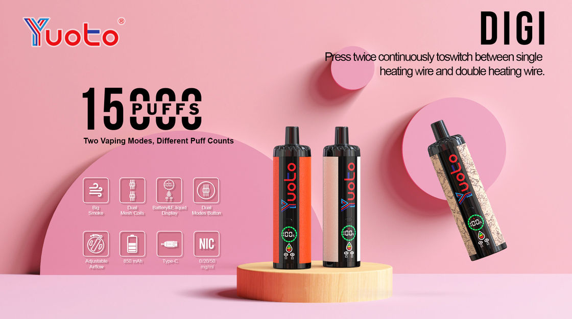 Yuoto DIGI 15000 Puffs Daul Mesh Coil Vape LED Screen ব্যাটারির জ্বালানি স্তর